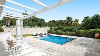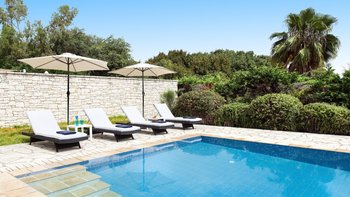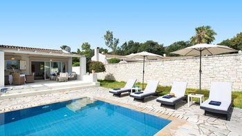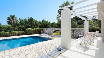 Pebbles ist eine gut verbundene, moderne Villa mit zwei Schlafzimmern in Kassiopi, Korfu, ideal für kleine Familien, die in der Sonne entspannen und die Insel auf eigene Faust erkunden möchten.