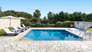 Draußen bietet die sorgfältig gestaltete, wunderschön stilvolle Terrasse mit Steinfinish Blick auf das Herzstück der Villa, den Pool. Es beherbergt auch einen Essbereich im Freien, in dem man gemütliche hausgemachte Abendessen auf dem Grill genießen und sich in der Sommerhitze entspannen kann. Weitere Restaurants, Bars und Supermärkte finden Sie in Kassiopi, das einen Kilometer entfernt liegt, sowie mehrere Restaurants in Avlaki, die viel näher an der Villa liegen. Etwas weiter draußen bietet St. Stephano ähnliche Erlebnisse, wo es viele einzigartige Gerichte gibt, die Sie probieren können. Für einige näher gelegene Sehenswürdigkeiten ist der Strand von Coyevinas nur zweihundert Meter von der Unterkunft entfernt, ebenso wie der Strand von Avlaki, der etwas mehr als einen Kilometer entfernt ist.