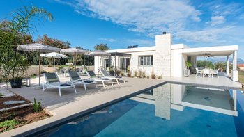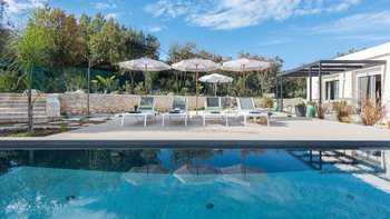Das elegante und stilvolle Interieur der Villa Amavi bietet einen offenen Wohnbereich mit natürlichem Licht, in dem die Küche, der Wohn- und Essbereich mühelos in die großen Pergolen übergehen. Zwei Schlafzimmer mit eigenem Bad führen direkt zum Poolbereich und schaffen eine intuitive Innen- und Außenlebensumgebung. Dessen markanteste Merkmal des Anwesens ist sein weitläufiges 45 Quadratmeter großes Glamping-Safarizelt, das zwischen Eichen- und Olivenbäumen liegt und ein Gefühl von Privatsphäre und Abgeschiedenheit bietet, während es nur 40 Meter vom Haupthaus entfernt ist. Es dient als privates drittes Schlafzimmer mit eigener Terrasse, Liegestühlen und Grillplatz.