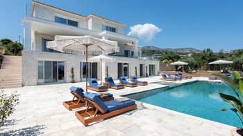 Ein stilvolles Refugium mit sechs Schlafzimmern, nur wenige Minuten vom Avlaki Beach entfernt, verbindet die Villa Cassopo modernen Komfort mit einfachem Zugang zu Korfus pulsierender Küste.