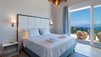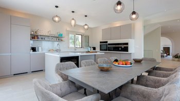 Jedes der sechs Schlafzimmer mit eigenem Bad öffnet sich entweder auf einen Balkon oder eine Terrasse, wodurch die erhöhte Lage und das natürliche Licht der Villa optimal genutzt werden. Deren Aufteilung ist ideal für Familien oder Gruppen, mit vier Doppelzimmern, darunter eine Master-Suite mit Kingsize-Bett, und zwei Zweibettzimmern. Eine offene, voll ausgestattete Küchenzeile geht in den Essbereich im Freien über und lädt die Gäste ein, entspannte Mahlzeiten im Freien zu genießen, die mit Leichtigkeit zubereitet werden.