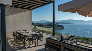 Die Außenbereiche sind einfach spektakulär. Weitläufige Terrassen umgeben die Villa und führen zu einem Infinity-Pool, der nahtlos mit dem Meer dahinter zu verschmelzen scheint. Ein schattiger Wohn- und Essbereich bietet eine einzigartige Kulisse für Mahlzeiten im Freien. Dessen Außenküche und die Bar sind ideal für Versammlungen unter der griechischen Sonne. Ein privater Weg von der Terrasse führt zu einer abgeschiedenen Bucht, wo sich die Gäste am kristallklaren Wasser in absoluter Privatsphäre entspannen können.