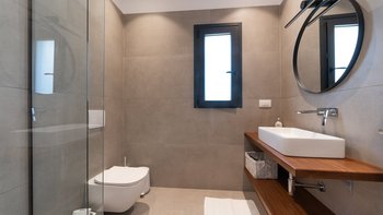 Die erste Etage hebt den Charme der Villa mit ihren intimen Räumen zur Entspannung hervor. Jedes Zimmer auf dieser Ebene verfügt über ein eigenes Bad, das in neutralen Farbtönen gehalten ist und eine ruhige Atmosphäre schafft. Die Innenräume sind von weißen Farbtönen mit subtilen Beige-Akzenten geprägt, die das ruhige Ambiente der Villa ergänzen. Alle Schlafzimmer öffnen sich zu einer Terrasse mit Blick auf das azurblaue Wasser und bieten den Gästen einen ungestörten Blick auf die natürliche Schönheit Korfus.