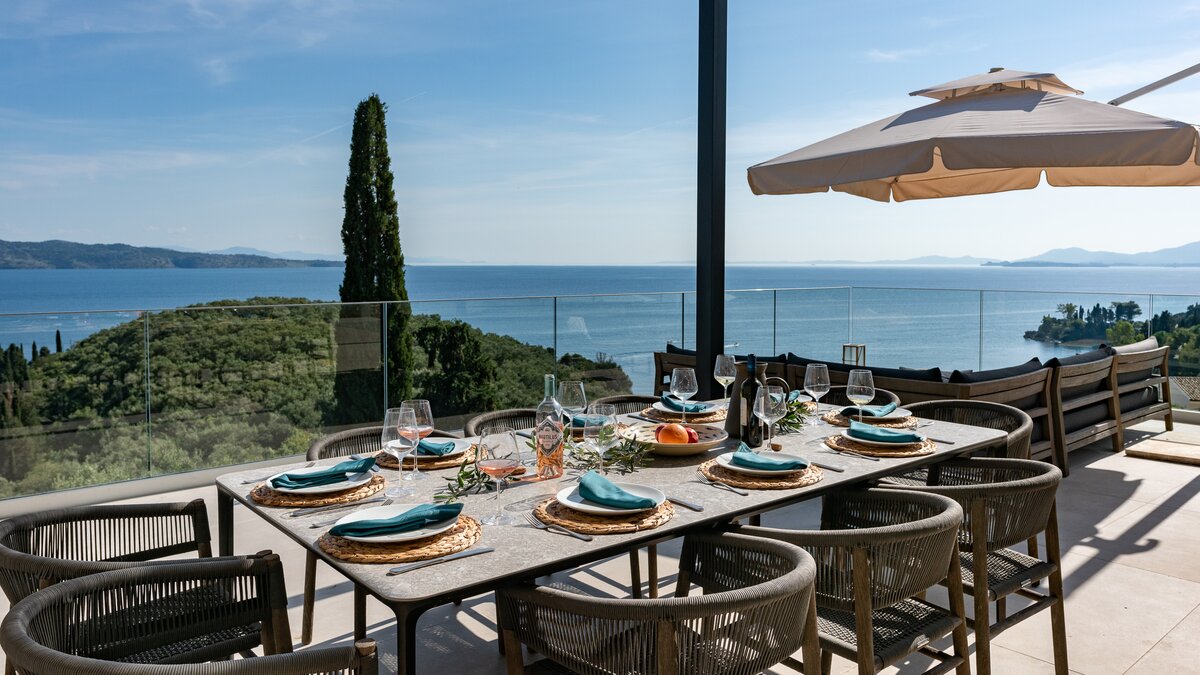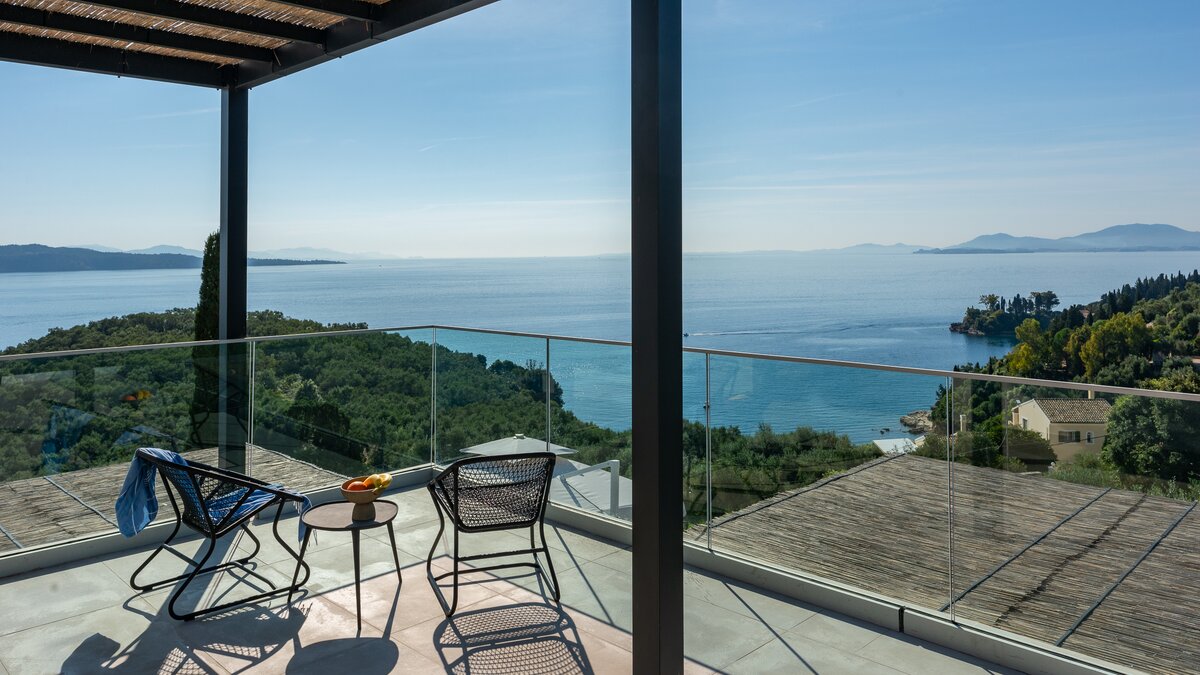 Die Villa Lefkothea liegt auf einem Hügel zwischen zwei Buchten und bietet Panoramablick auf die Stadt Korfu, das Ionische Meer und die Berge Albaniens.