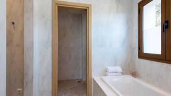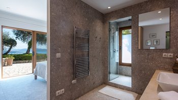 • Master-Doppelzimmer (Super-Kingsize-Bett) mit Bad en suite und separater Dusche, die Zugang zur Terrasse führt