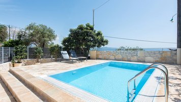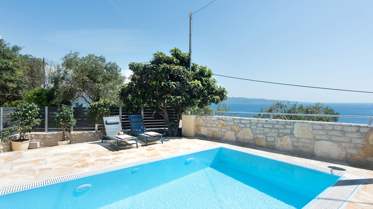 Im Freien lädt eine große, von Bäumen und Pergolen beschattete Terrasse zu gemütlichen Frühstücken oder abendlichen Drinks ein. Der Privater Pool mit Blick auf das Ionische Meer bietet einen erfrischenden Ort, um sich zu entspannen, während Sie die Aussicht genießen. Ein eingebauter Grill und mehrere Liegebereiche machen diesen Raum ideal für entspannte Tage und entspannte Abende unter dem Sternenhimmel.