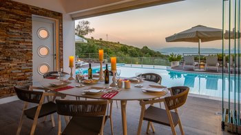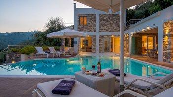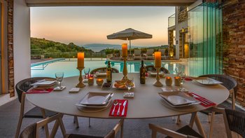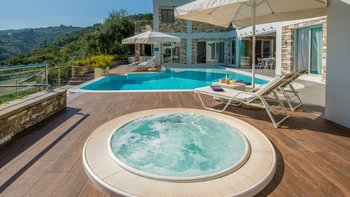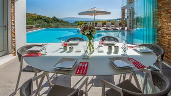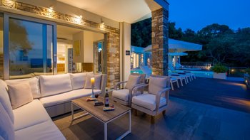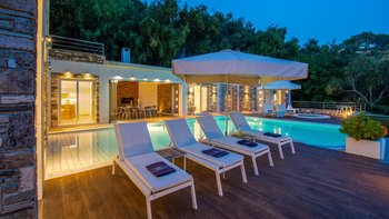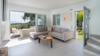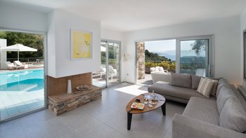 In einer zeitlosen Landschaft aus hohen Zypressen, verwinkelten Oliven und anmutigen Eukalyptusbäumen strahlt diese eindrucksvolle Villa Stil und Qualität aus und prägt ihre klassische korfiotische Umgebung sehr modern. Draußen rahmen die Steinmauern riesige Glasschiebetüren ein, die einen beeindruckenden Freiform-Infinity-Pool mit herrlichem Blick auf die Bucht von St. Stephano bieten. Der Pool mit seinen sanft abfallenden, seichen Wade-in-Tiefen wird von einem gemahlenen Holz-Sonnendeck umgeben, das durch ein schattiges, stilvolles „Wohnzimmer“ im Freien ergänzt wird.