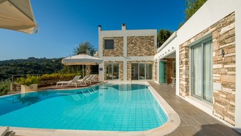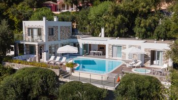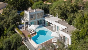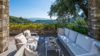 In einer zeitlosen Landschaft aus hohen Zypressen, verdrehten Oliven und anmutigen Eukalyptusbäumen strahlt diese beeindruckende Villa Stil und Qualität aus und prägt ihre klassische korfiotische Umgebung sehr modern.