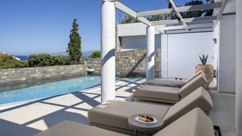Die individuell gestalteten und voll klimatisierten Villen sind mit raffinierter Eleganz eingerichtet und verfügen jeweils über luxuriöse Marmorbäder mit Jacuzzi-Badewannen, einen Privater Pool mit Jacuzzi und eine offene, möblierte Terrasse mit idyllischer Aussicht. Der Elounda Villa verfügt über zwei Schlafzimmer mit Bad und eine offene Küche/Wohn-/Esszimmer mit Türen zur Poolterrasse. Kochservice und Massagen in der Villa sind nur einige der optionalen Extras.