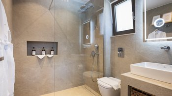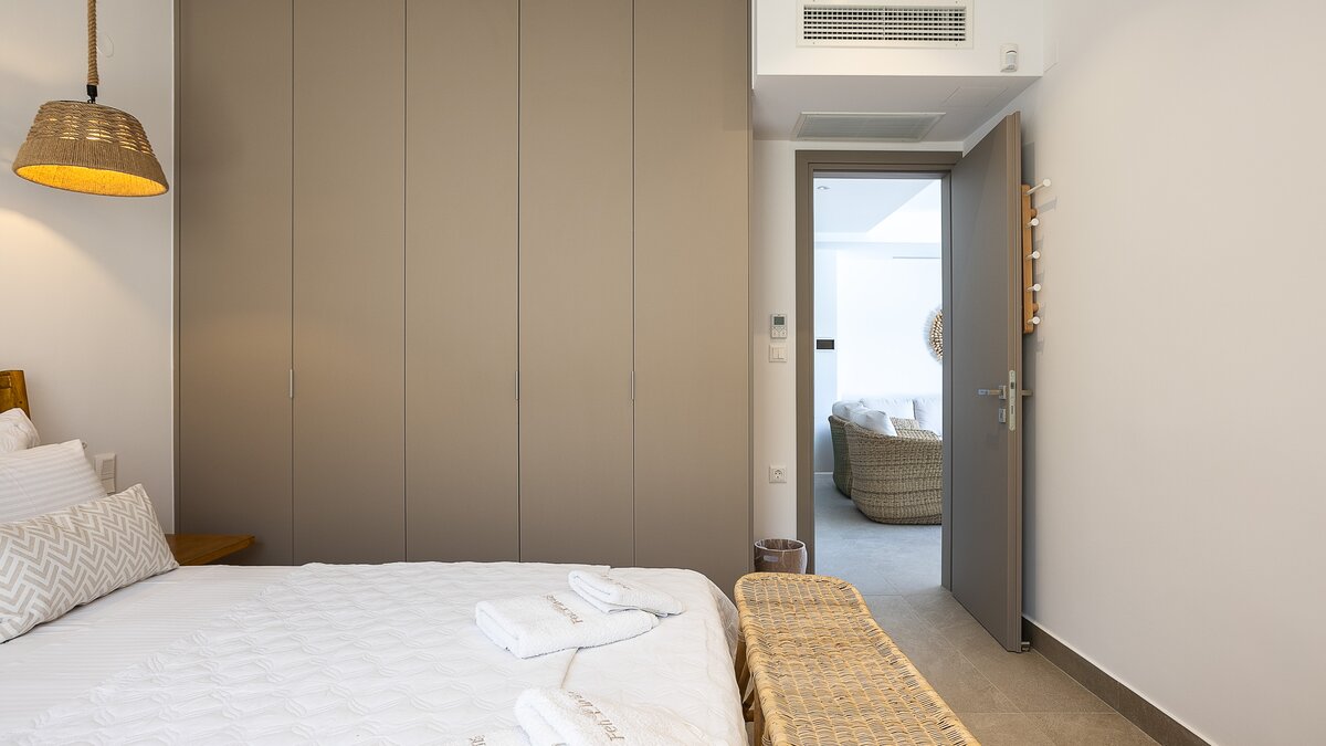 Im Erdgeschoss befindet sich ein offener Wohnbereich, in dem Küche, Ess- und Sitzbereiche zusammenkommen und sich zur Poolterrasse hin öffnen. Auf dieser Ebene befinden sich auch ein Kingsize-Schlafzimmer und ein begehbares Bad mit Dusche. Im Obergeschoss befinden sich zwei weitere helle Schlafzimmer, beide mit Balkonen mit Blick auf das Dorf und die umliegenden Grünanlagen, ein Doppelzimmer und ein flexibles Zweibett, das in ein Kingsize-Bett umgewandelt werden kann, sowie ein zweites Duschbad.