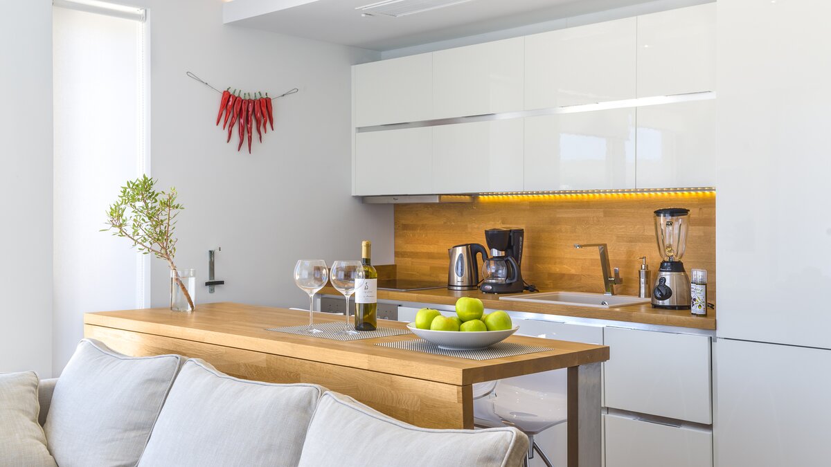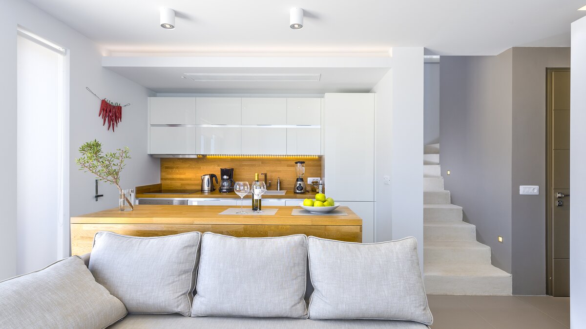 Herzstück der Villa ist ein geräumiger, lichtdurchfluteter Wohnbereich mit einer voll ausgestatteten Küche, einem Essplatz und einem luftigen Wohnzimmer mit Zugang zu einer großen Terrasse. Ein solarbeheizter Infinity-Pool mit römischer Treppe lädt hier zu langen, entspannten Tagen ein, umgeben von duftenden Gärten mit Rosmarin, Thymian und Oleander.