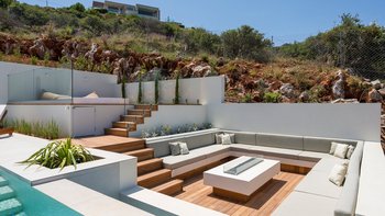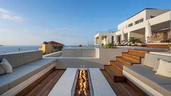 Im Außenbereich gibt es viele Lokale zum Essen und Trinken, jeweils begleitet von einem herrlichen Blick auf die Berge und das Meer. Es gibt zwei beheizte Swimmingpools sowie einen Jacuzzi, eine Feuerstelle und einen Essbereich mit Grill für ein gemütliches Mittagessen.