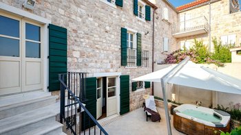 Eingebettet in die Straßen der Altstadt von Hvar und nur drei Minuten zu Fuß vom Stadtplatz entfernt, ist dieses wunderschöne Anwesen der perfekte Ort für Familien oder Freunde, die die Insel Hvar erkunden möchten. Hvar House ist eine renovierte und moderne Villa mit wunderschönen Steinfassaden, klassischen grünen Fensterläden und viel modernem Komfort. Es gibt zahlreiche Außenbereiche zum Entspannen, darunter einen charmanten Essbereich im Freien neben dem privaten, geschlossenen Pool, einen Jacuzzi auf der vorderen Terrasse und einen Obstgarten. Mit einer flexiblen Aufteilung für Familien oder größere Gruppen verfügt das Hvar House über vier Schlafzimmer in der Hauptvilla und eines in einem Nebengebäude, alle mit eigenem Bad. Im Inneren wurde das Anwesen sorgfältig zu einem hohen Standard eingerichtet und mit neutralen Farbtönen, freiliegenden Steinmauern und Holzböden dekoriert. Deren Haupthaus erstreckt sich über drei Ebenen mit zwei Schlafzimmern auf halben Stockwerken. Im Erdgeschoss öffnet sich die OFFENER GRUNDRISS Küche, das Wohn- und Esszimmer auf eine Terrasse. Deren obere Ebene beherbergt das Hauptschlafzimmer mit Super-Kingsize-Bett, Bad en suite mit Badewanne und separater Dusche und direktem Zugang zu einer großen privaten Terrasse mit einem komfortablen Sitzbereich und herrlichem Blick auf die Küste von Hvar.