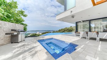 Treten Sie ein in eine Oase des Luxus und der Moderne in der Villa Spectra. Dieser Villa mit 4 Schlafzimmern auf der Insel Hvar bietet einen unglaublichen Blick auf die Blaue Bucht. Deren Innenräume sind wunderschön hell, mit modernen Möbeln und Schlafzimmern mit eigenem Bad. Jedes Schlafzimmer ist mit einem Kingsize-Bett, einem TV und herrlichem Meerblick ausgestattet. Deren Villa ist ideal für einen Wellness-Urlaub und verfügt über eine Sauna und einen Fitnessraum. Es gibt eine elegante, voll ausgestattete Küche mit einem schönen Essbereich sowie ein sehr geräumiges Wohnzimmer mit einem großen Flachbild-TV für gemütliche Filmabende. Draußen befindet sich ein großer beheizter Pool neben einer sonnengeküssten Terrasse und Liegestühlen. Es gibt auch einen Whirlpool, einen Grill und einen eleganten, überdachten Essbereich im Freien.