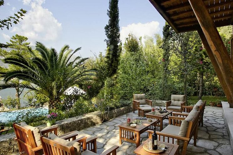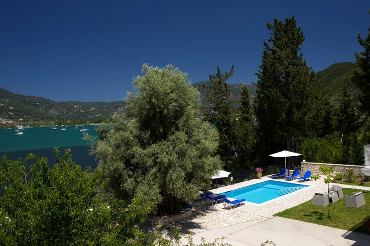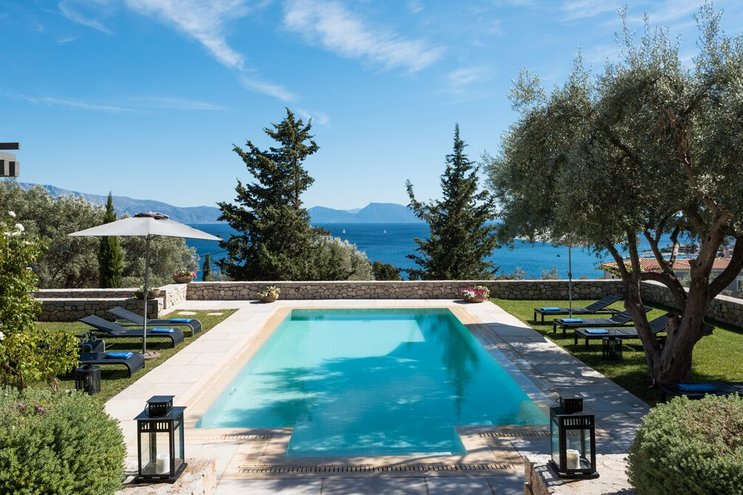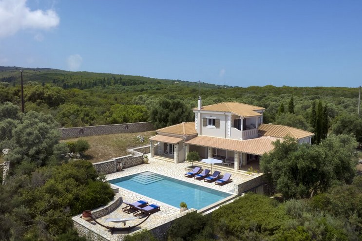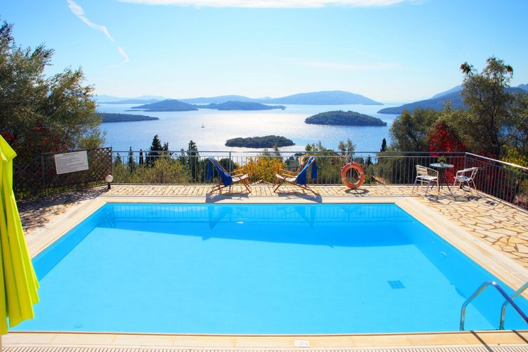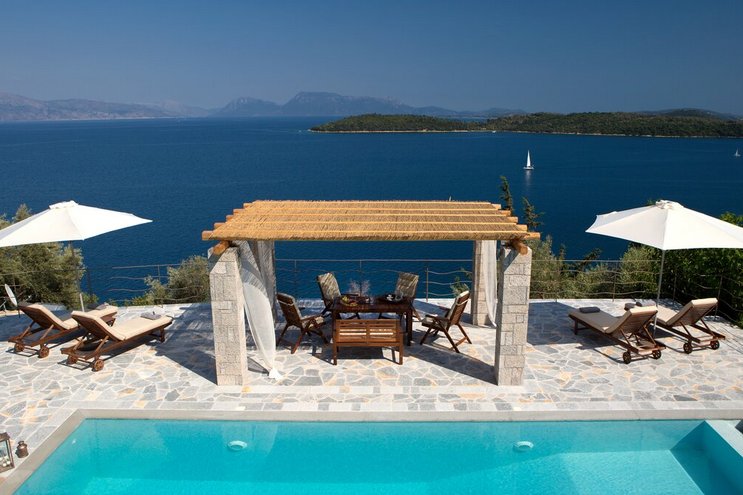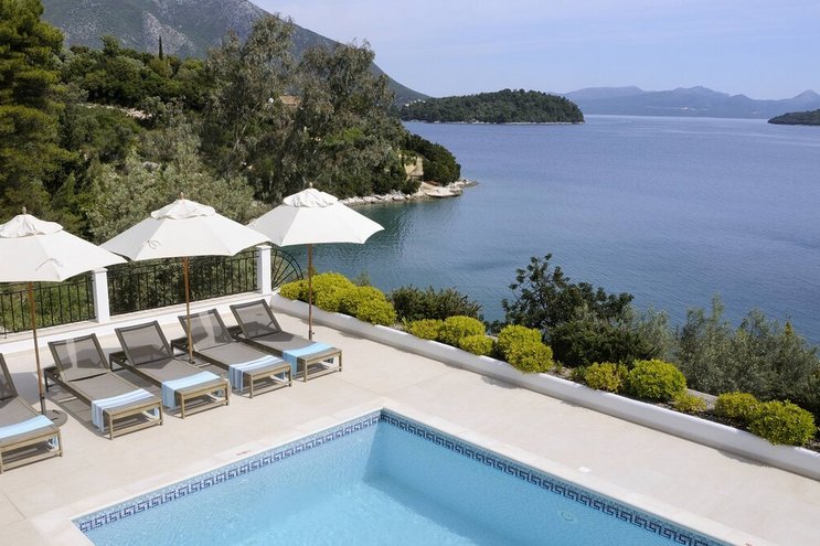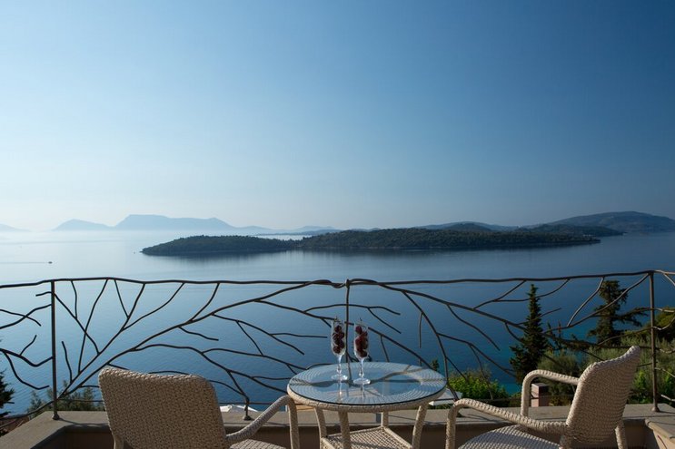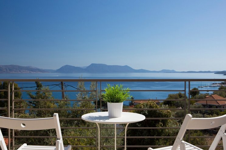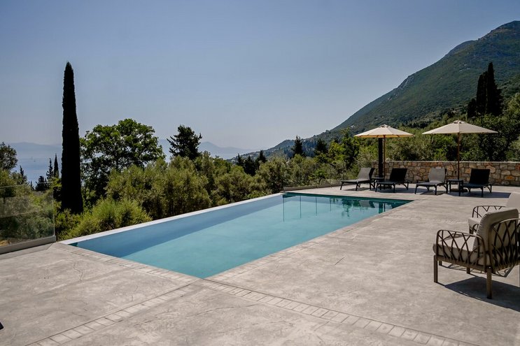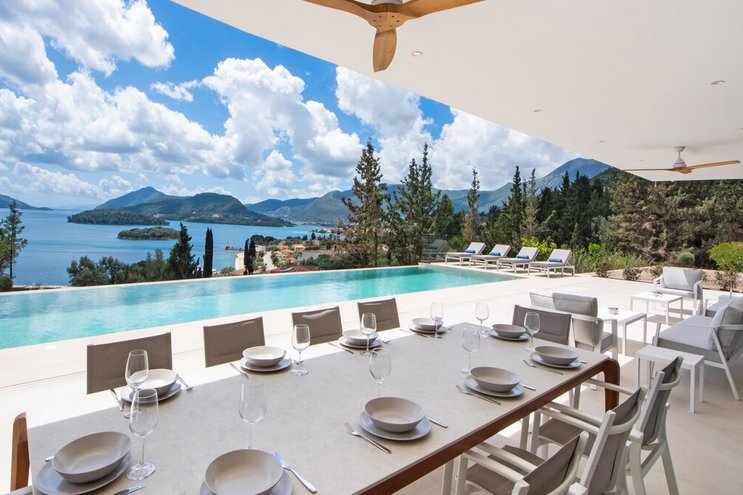 Eine geräumige Villa mit vier Schlafzimmern und großen Terrassen, von denen aus Sie den atemberaubenden Blick über das glitzernde Wasser des Ionischen Meeres genießen können, übersät mit üppigen grünen Inseln und Segelbooten.
