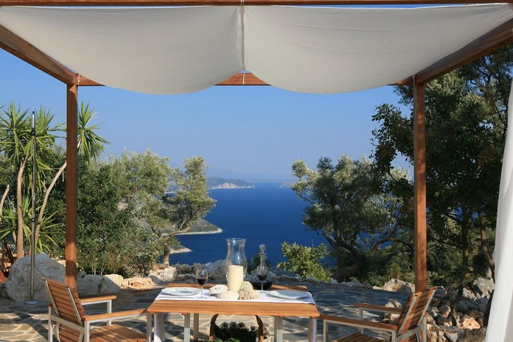 Eine kleine, aber fein geformte Villa in einer reizvollen Umgebung mit Blick auf die Inseln Skorpios und Sparti und in der Nähe eines bezaubernden Kieselstrandes.