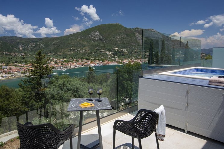 Im Aiolos in Lefkada sind atemberaubende Ausblicke auf die Bucht, eine stilvolle, moderne Einrichtung und ein wohltuender beheizter Jacuzzi perfekt aufeinander abgestimmt.