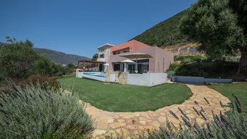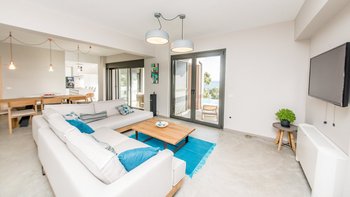 Der Azure Point befindet sich in einer wirklich atemberaubenden Lage direkt am Wasser und bietet einen ununterbrochenen Blick auf das Meer und einen Pfad, der zu einem Felsvorsprung führt, der in das glitzernde Ionische Meer ragt. Deren Außenbereich ist sorgfältig gestaltet, um das Beste aus der unglaublichen Aussicht zu machen, mit einem privaten Infinity-Pool, der in eine Terrasse versenkt ist, die mit großen Liegestühlen und weichen Sitzgelegenheiten ausgestattet ist. Deren Haus selbst ist so gestaltet, dass die Grenzen zwischen Innen- und Außenleben verwischt werden, mit Glasschiebetüren in der modernen, gut ausgestatteten Küche, die sich komplett zur Terrasse öffnet, um ein Gefühl im Freien zu schaffen. Von der Küche aus führen einige Stufen in das OFFENER GRUNDRISS Wohn- / Esszimmer, ebenfalls mit Schiebetüren, die zur Terrasse führen und den Raum mit Licht durchfluten.