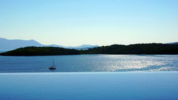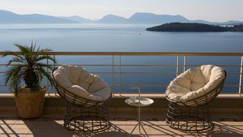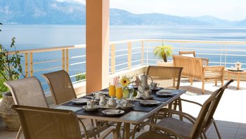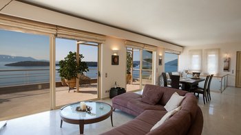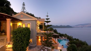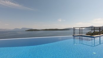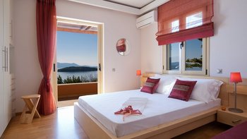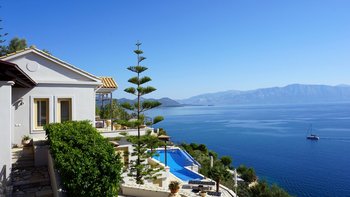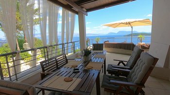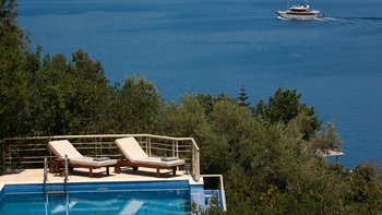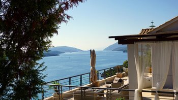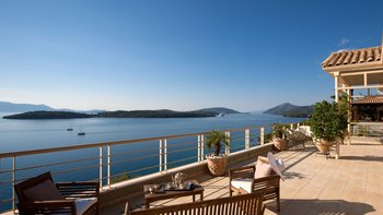 Eine geräumige Villa mit vier Schlafzimmern und großen Terrassen, von denen aus Sie den atemberaubenden Blick über das glitzernde Wasser des Ionischen Meeres genießen können, übersät mit üppigen grünen Inseln und Segelbooten.