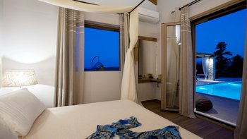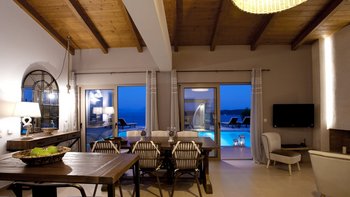 Eine kleine, aber fein geformte Villa in einer reizvollen Umgebung mit Blick auf die Inseln Skorpios und Sparti und in der Nähe eines bezaubernden Kieselstrandes.