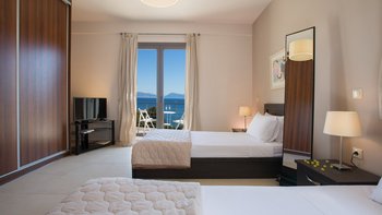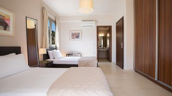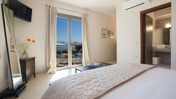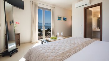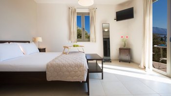 Die Villa Timo bietet Platz für sechs Personen in drei Schlafzimmern, jedes mit eigenem Bad, ideal für Familien oder Freunde, die Privatsphäre und Komfort suchen. Ein Schlafzimmer liegt versteckt im Erdgeschoss und öffnet sich direkt auf die Terrasse und den Pool. Im Obergeschoss befindet sich ein Schlafzimmer mit Doppelbett und ein Zweibett, beide mit Zugang zu einem Balkon, von dem aus Sie einen Blick auf das Meer und die Berge haben.