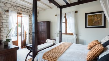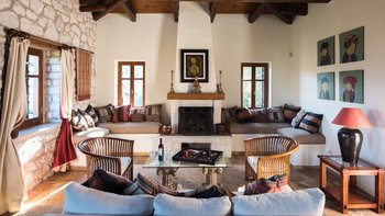 Ideal für zwei Familien oder eine Gruppe von Freunden, ist die Unterkunft in zwei separate Steinvillen aufgeteilt. Im Haupthaus befindet sich im unteren Erdgeschoss ein großes, ungezwungenes Zimmer mit Fernseher und zwei großen Betten, was es zu einem guten Familien- oder Teenagerzimmer macht. Drei der vier Schlafzimmer des To Petrino mit eigenem Bad können zu zwei Einzelbetten umgewandelt werden. Deren vierte, im Gästehaus, verfügt über ein romantisch drapiertes Himmelbett. Deren Villa ist 1,5 km vom geschäftigen kleinen Nidri und fünf Minuten zu Fuß von einer lokalen Taverne entfernt, mit einer Auswahl an Stränden im Umkreis von 5 km.