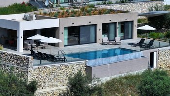 Die Villa Dahlia ist eine moderne Villa mit zwei Schlafzimmern in Lefkada, Griechenland, mit einem eleganten, stilvollen Interieur und einem entspannenden Infinity-Poolbereich, umgeben von einem Meer aus natürlichem Grünes.