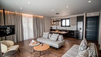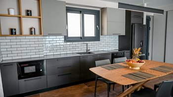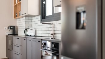 Im Inneren werden die Gäste von einem offenen Raum empfangen, der die Küche, den Ess- und den Wohnbereich nahtlos integriert. Denen sanften Grautöne schaffen eine beruhigende Atmosphäre, während die voll ausgestattete Küche zu kulinarischen Entdeckungen einlädt. Dessen Hauptschlafzimmer mit eigenem Bad verspricht eine erholsame Nachtruhe. Dessen zweite Schlafzimmer mit zwei Einzelbetten sorgt für eine komfortable Unterkunft für alle Gäste. Beiden Zimmer sind durchdacht mit offenen Schränken und Schreibtischen ausgestattet, während das Gemeinschaftsbad mit einer wunderbaren Auswahl an Pflegeprodukten bestückt ist.