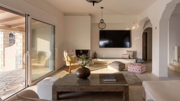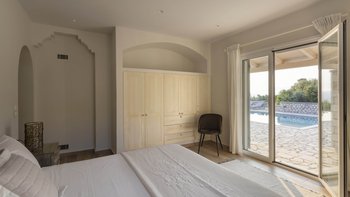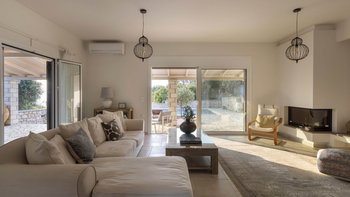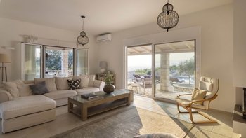 Im Inneren strahlt die Villa eine warme und einladende Atmosphäre aus. Dessen geräumige Wohnzimmer fließt mühelos in die Küche und den Essbereich über und schafft so einen einladenden Raum für gemeinsame Mahlzeiten. Zwei gut ausgestattete Schlafzimmer im Erdgeschoss – eines davon mit eigenem Duschbad – öffnen sich direkt auf die Terrasse und den Poolbereich, sodass es leicht ist, einen morgendlichen Kaffee oder ein abendliches Bad nach draußen zu nehmen. Deren Hauptschlafzimmer im Obergeschoss verfügt über ein eigenes Duschbad und Zugang zu einer Panoramaterrasse, von der Sie die atemberaubende Aussicht genießen können. Mit Klimaanlage und einem Heimkinosystem für gemütliche Nächte wurde jedes Detail sorgfältig für Ihren Komfort durchdacht.