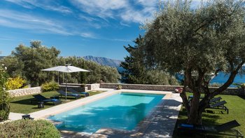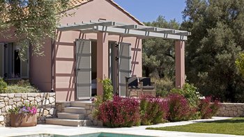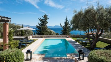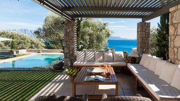 Ein hübsches rosafarbenes Haus mit herrlichem Blick über das Blau der Bucht, dies ist eine moderne Luxusvilla in Lefkada, in einer ruhigen, abgelegenen Lage, aber nahe genug, um zum Strand zu spazieren.