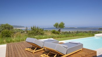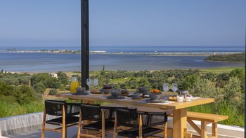 Vor der Tür steht der Privater Pool der Villa im Mittelpunkt; ein ruhiger Ort für ein morgendliches Bad oder lange Nachmittage unter der griechischen Sonne. Dessen großzügige Veranda und der umliegende Garten laden zum Essen im Freien oder einfach zum Entspannen in der sanften Meeresbrise ein. Wenn der Abend hereinbricht, färbt der ionische Sonnenuntergang den Horizont in goldenen und rosafarbenen Farbtönen; die perfekte Kulisse für ein unvergessliches Barbecue mit der Familie oder Freunden.