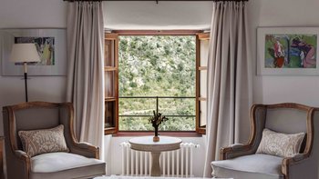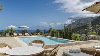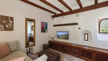 Im Erdgeschoss gibt es eine moderne Küche mit rustikalen Elementen und ein geräumiges, aber gemütliches Wohn-/Esszimmer mit Stufen zu einem separaten Fernsehbereich. Ein zweites Wohnzimmer befindet sich im Turm. Der geschützte zentrale Innenhof mit Außenküche und Grill und der weiche Sitzbereich mit Panoramablick auf das Meer bieten ausgezeichnete Plätze zum Entspannen, während die herrliche Terrasse ideal für ein Abendessen im Freien ist. Von der Villa führt eine Treppe hinunter zum schönen privaten beheizten Pool, der von blumengeschmückten Gärten umgeben ist. Auf dem Anwesen befindet sich ein Tennisplatz, den Son Balagueret mit den Schwestervillen Sa Punta und Sa Terra teilt.