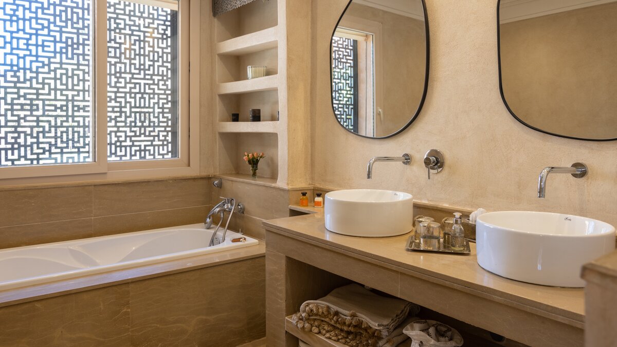 Im Inneren des Haupthauses befindet sich ein luftiger, offener Wohn- und Essbereich mit TV-Bereich, der auf die Terrasse hinausreicht; ein weiterer Fernsehraum bietet einen gemütlichen Ort für Filmabende. Deren Hauptsuite verfügt über ein Badezimmer en suite; ein weiteres Doppelzimmer verfügt über ein elegantes Duschbad en suite und drei weitere Schlafzimmer en-suite runden die Unterkunft ab. Ein besonderes Highlight ist die Gastronomie: Dessen hauseigenes Team kreiert individuelle Menüs, die duftende marokkanische Aromen mit europäischen Favoriten vermischen, oft mit Produkten aus dem großzügigen Gemüsegarten.