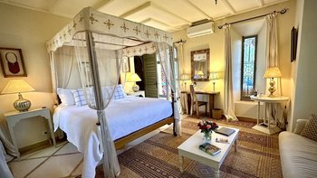 Eine üppig angelegte Gartenanlage umgibt dieses äußerst elegante Haus und bietet einen sehr hohen Standard an Komfort und exzellenten Service. Innerhalb des Hauses befinden sich hoch ausgestattete Zimmer, die mit edlen Stoffen ausgestattet sind und durch wunderschöne Drucke und Gemälde ergänzt werden. Ein anmutiger Speisesaal öffnet sich zu einem schattigen Essbereich im Freien. Der Speisesaal ist offen zum äußerst eleganten Wohnzimmer, das sich wiederum zur Gartenterrasse öffnet, die wunderschön mit weichen Sitzgelegenheiten ausgestattet ist und sich perfekt für einen Drink vor dem Abendessen eignet.