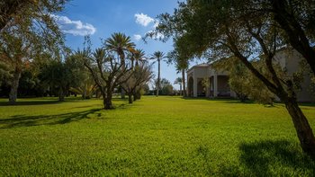 Der große Swimmingpool ist von Liegestühlen umgeben und befindet sich in einem 20 Hektar großen, wunderschön gepflegten Garten mit Palmen und Olivenbäumen. Dessen Anwesen befindet sich in der Nähe zahlreicher Golfplätze, gehobener Restaurants, Museen und kultureller Attraktionen in der Stadt Marrakesch und verfügt über Annehmlichkeiten wie ein Trampolin und Bereiche für Badminton, Basketball und Tischtennis. Dessen Villa Aradavi liegt nur 20 Minuten vom Stadtzentrum entfernt und ist ideal für Gäste, die die Wunder der Umgebung erkunden möchten.