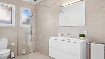 Treten Sie nach draußen auf die weitläufige Terrasse, auf der zwei verschiedene Bereiche warten: ein schattiger Essbereich im Freien und eine entspannende Lounge mit bequemen Sofas, die beide durch ferngesteuerte Markisen geschützt sind. Hier können die Gäste ein gemütliches Frühstück, Cocktails bei Sonnenuntergang oder einfach die ruhige Atmosphäre genießen. Dessen Highlight ist der private Swimmingpool mit Liegestühlen, auf denen Sie sich in der mediterranen Sonne sonnen können, und ein eingebauter Grillplatz, der sich ideal für Mahlzeiten im Freien eignet.