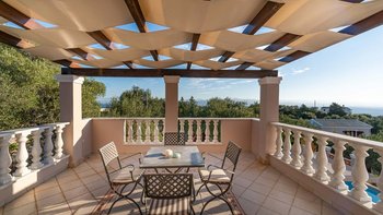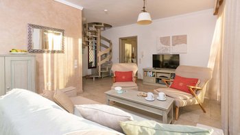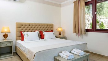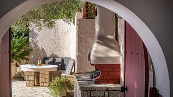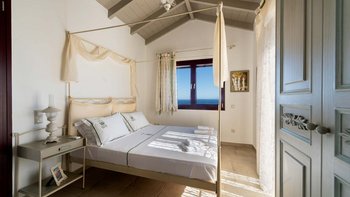 Die Innenräume der Villa Theos sind ein Zeugnis des raffinierten Küstenstils. Deren offene Wohnbereich ist mit beruhigenden Pastelltönen, hellen Holzarbeiten in getünchten Farben und kühlen grauen Steinböden geschmückt. Lebendige Stoffe sorgen für einen auffälligen Kontrast und schaffen eine harmonische und einladende Atmosphäre. Deren voll ausgestattete Küche öffnet sich auf eine Seitenterrasse mit einem Grillplatz, auf dem Sie unter dem Sternenhimmel im Freien speisen können. Deren Schlafzimmer und Wohnräume sind außerdem mit großen Fenstern ausgestattet, die eine faszinierende Aussicht einrahmen und dafür sorgen, dass die Schönheit der Umgebung nie weit entfernt ist.