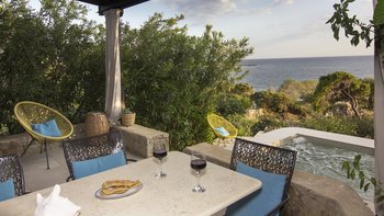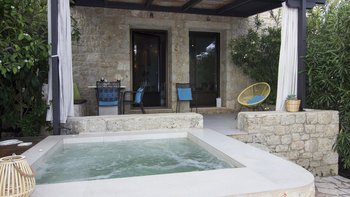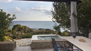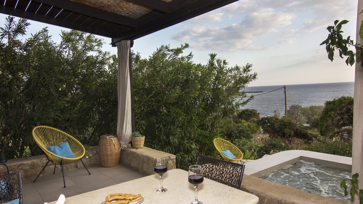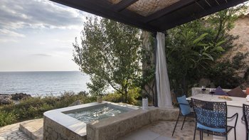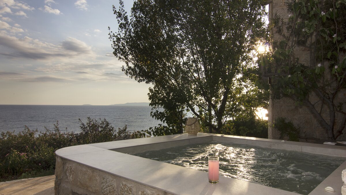 In den geräumigen Innenräumen dieser stilvollen Villa herrscht ein Gefühl der Gelassenheit. Vielleicht liegt es an dem Hintergrundrauschen des Meeres, das auf den Felsen unter Ihnen plätschert, oder an der attraktiven Verwendung natürlicher Materialien, die dem Haus einen Platz in renommierten Designmagazinen eingebracht haben, oder einfach daran, dass es nach den Grundsätzen des Feng Shui geplant und gestaltet wurde. Wahrscheinlich alle drei tragen ihren Teil dazu bei, ergänzt durch eine bequeme Einrichtung, ein aufgeräumtes Dekor in Erdtönen und eine herrliche Essterrasse, die sich direkt über einem von Felsen eingerahmten Sechs-Sitz-Whirl befindet und beide einen herrlichen Blick auf die Bucht bieten. Die drei klimatisierten Schlafzimmer der Villa sind eine ausgezeichnete Wahl für eine Familie oder eine Gruppe von Freunden und verfügen jeweils über ein eigenes Bad oder ein Duschbad. Deren Zimmer im Erdgeschoss bieten die Flexibilität von Doppel- oder Zweibettnutzung, während das Doppelzimmer im Obergeschoss sich auf einen schönen möblierten Balkon öffnet. Mit einem Felsenbad direkt darunter liegt die Villa nur wenige Schritte von den Geschäften, Bars und Tavernen von Stoupa und dem Sandstrand von Stoupa entfernt.