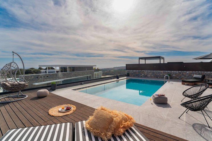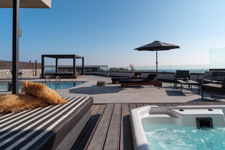 Perfekt als romantischer Rückzugsort für zwei Personen, Rodos Blu ist eine moderne Villa mit stilvollem Interieur, herrlicher Aussicht und einem eigenen beheizten Jacuzzi.