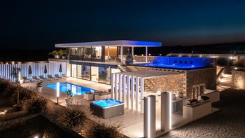 Diese Villa verfügt über zwei Terrassen, eine auf beiden Seiten. Auf der einen Seite können die Gäste am Poolbereich entspannen, mit einem beheizten Whirlpool und einem Essbereich mit einem Doppel-Insel-Grillplatz. Auf der anderen Seite befindet sich ein großer Sitzbereich mit einem externen Kamin. Im Untergeschoss befindet sich eine separate, vollwertige Küche mit individueller Dusche und Bad, ideal für die Vorbereitung von Partys und externen Catering-Services.