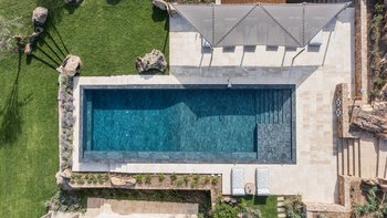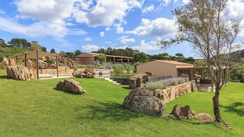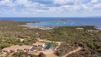 Im Außenbereich erstreckt sich ein schillernder Infinity-Pool über die Terrasse, umrahmt von üppigen Gärten und Panoramablick auf das Meer. Eine weitläufige Sonnenterrasse lädt zum Entspannen unter der Sonne Sardiniens ein, während ein mit Pergola überdachter Essbereich den perfekten Rahmen für Mahlzeiten im Freien bietet. Ein kurzer Spaziergang führt zu einem privaten Strandbereich, wo goldener Sand und ruhiges Wasser friedliche Momente am Meer bieten.