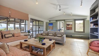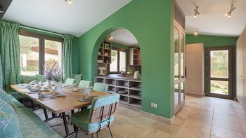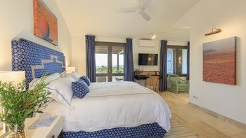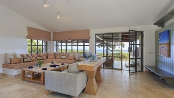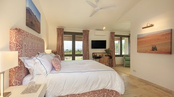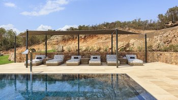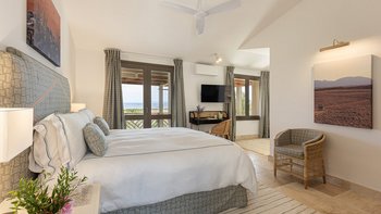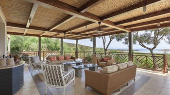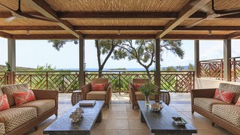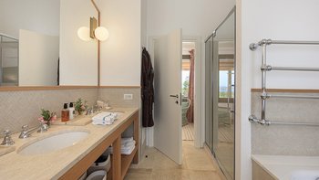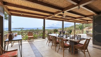 Im Inneren zelebrieren die lichtdurchfluteten Wohnräume die umliegende Landschaft mit großen Fenstern, die die Grüne und die Meereslandschaft umrahmen. Dessen moderne Küche und der Essbereich sind mit einer frischen, lebendigen Ästhetik gestaltet und machen Unterhaltung zu einem Vergnügen. Vier wunderschön eingerichtete Doppelschlafzimmer sind auf zwei Etagen angeordnet, jedes mit Zugang zur Terrasse, eigenem Bad und Meerblick. Im Obergeschoss befinden sich zwei Schlafzimmer mit separaten Sitzbereichen, während drei Zimmer mit optionalen Schlafsofas ausgestattet sind, die sich ideal für Familien oder größere Gruppen eignen.