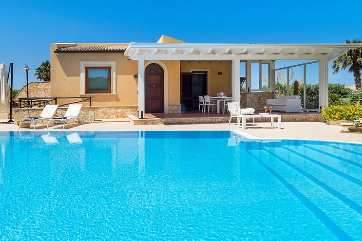 Eine gut ausgestattete moderne Villa mit einem atemberaubenden Poolbereich mit Blick auf das Meer. Dieser nach Süden ausgerichtete Villa ist sehr großzügig für eine kleinere Gruppe und liegt in der Nähe des Strandes und der historischen Stadt Sciacca.