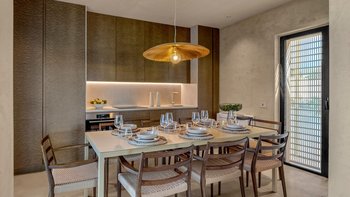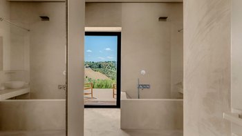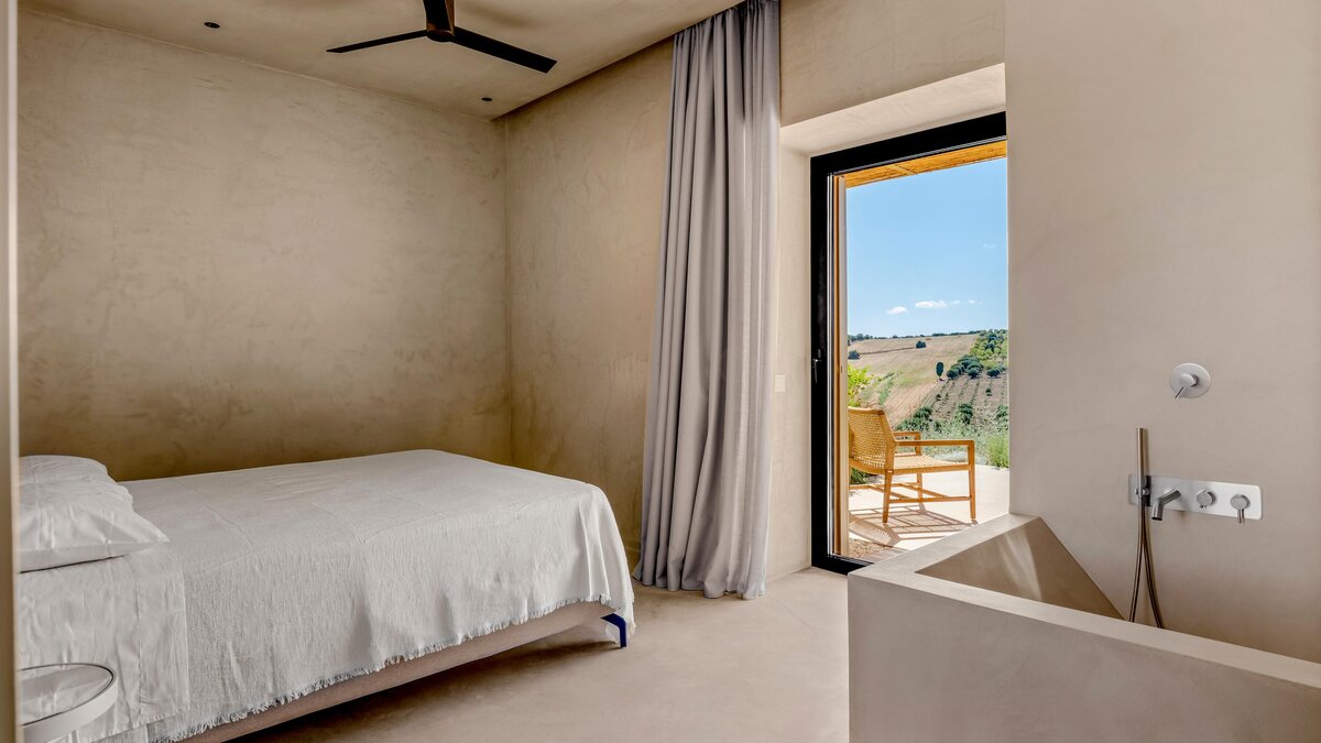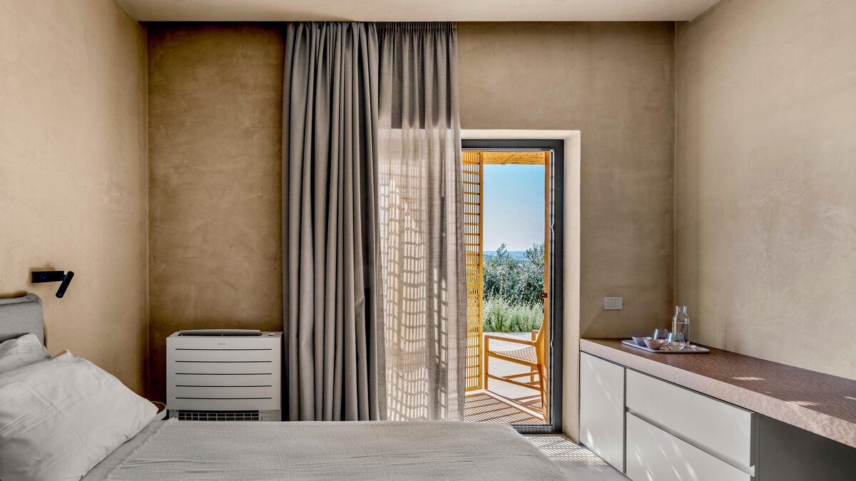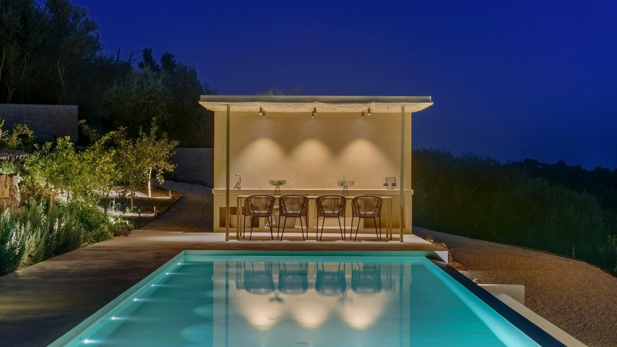 Das Design des The Olive Court spiegelt eine sorgfältige Balance zwischen modernem Komfort und lokalem Charakter wider. Deren Innenräume sind hell, raffiniert und einladend, mit klaren Linien und natürlichen Materialien, die die umliegende Landschaft widerspiegeln. Im Erdgeschoss fließt das Wohnzimmer mühelos in eine gut ausgestattete Küche und einen Essbereich über, ideal für entspannte Mahlzeiten und unkomplizierte Unterhaltung. Vier wunderschön eingerichtete Schlafzimmer bieten Komfort und Flexibilität: Drei Doppelschlafzimmer mit eigenem Bad führen direkt zum Garten, während ein Zweibettschlafzimmer mit eigenem Bad eine ebenso ruhige Umgebung bietet. Eines Suite verfügt über einen separaten Zugang, der den Gästen zusätzliche Privatsphäre bietet.