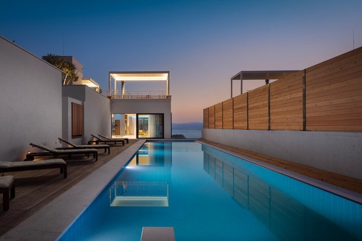 Die Villa Venus ist eine Meisterklasse in modernem Design und ist ein großzügiger Rückzugsort mit acht Schlafzimmern am Wasser in der Nähe von Split, Kroatien, mit zwei verschiedenen Poolbereichen, einem Home-Fitnessstudio und einer privaten Sauna.