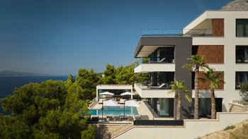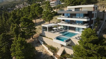 Die Villa Venus ist eine Meisterklasse in modernem Design und ist ein großzügiger Rückzugsort mit acht Schlafzimmern am Wasser in der Nähe von Split, Kroatien, mit zwei verschiedenen Poolbereichen, einem Home-Fitnessstudio und einer privaten Sauna.