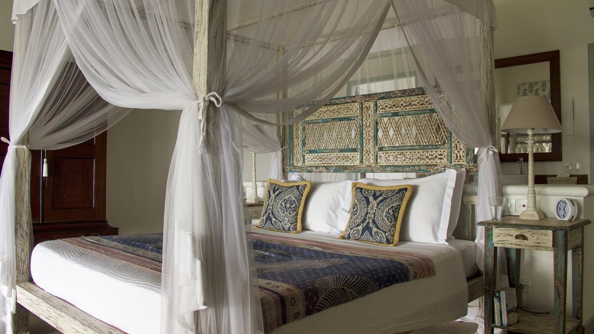 Die Villa selbst wurde wunderschön gestaltet und verfügt über einen großen offenen Wohnbereich mit bequemen Sitzgelegenheiten und hohen Holzbalkendecken. Dieser öffnet sich auf die Terrasse mit einem Tisch für Mahlzeiten im Freien und weitere Sitzgelegenheiten zum Entspannen. Der PRIVATER POOL ist ziemlich spektakulär, begleitet von Sonnenschirmen und Holzliegen mit Blick auf den Garten mit Rasen und auf das Meer. Dessen Erdgeschoss verfügt über zwei Schlafzimmer, die beide en suite mit Super-Kingsize-Himmelbetten sind. Auf der ersten Etage befindet sich ein weiteres Schlafzimmer mit Doppelbett mit Dusche, das über eine Außentreppe erreichbar ist.