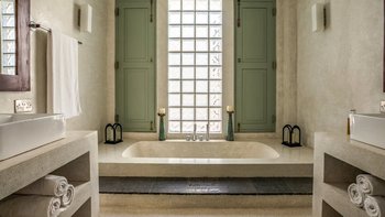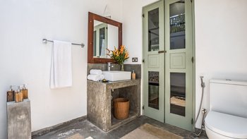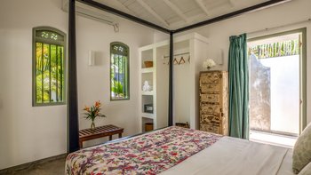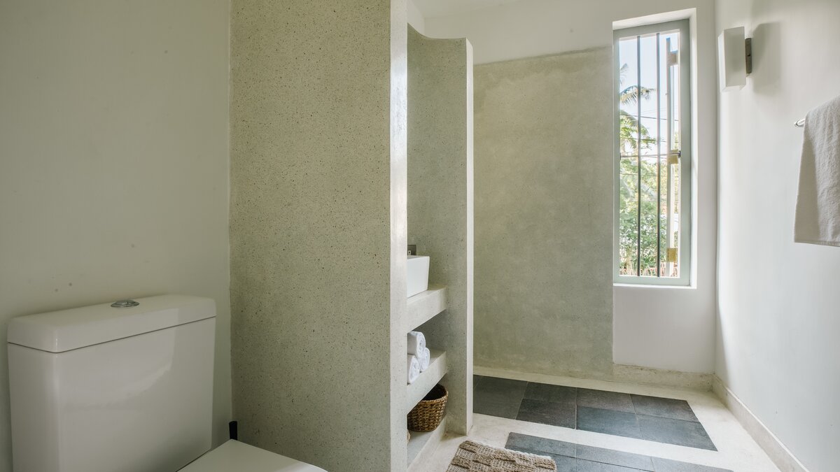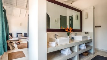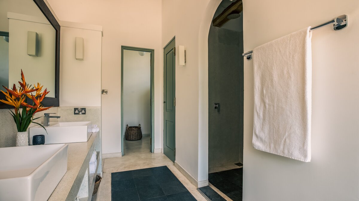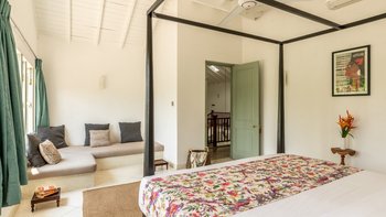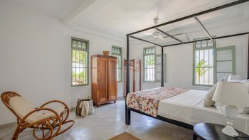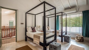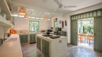 Im Inneren ist die Villa durchgehend hell und luftig, unterstützt durch die OFFENER GRUNDRISS Aufteilung der Wohnbereiche und der Küche. Große französische Fenster blicken auf den Poolbereich zwischen dem Haupthaus und dem Poolhaus und lassen viel natürliches Licht in das Anwesen ein. Der Hauptwohnbereich hat hohe Decken und ist aufwendig mit kleinen Details dekoriert, mit eleganten Mahagoni-Bannistern, die die Gäste bis in den ersten Stock bringen, wo sich jedes der vier geräumigen Schlafzimmer des Haupthauses befindet. Jedes Schlafzimmer verfügt über ein eigenes Bad, während das Hauptschlafzimmer en suite mit einer begehbaren Doppeldusche, zwei Waschtischen und einer separaten Toilette abgeschirmt ist, um den Gästen den größtmöglichen Komfort zu bieten. Das Poolhaus ist ebenfalls sehr geräumig und verfügt über eine OFFENER GRUNDRISS Küche und einen Wohnbereich. Jedes der beiden geräumigen Schlafzimmer ist mit einem eigenen Bad im Freien mit einer ebenerdigen Dusche verbunden. Frische weiße Wände und schöne pastellgrüne Akzente runden diesen Raum ab.