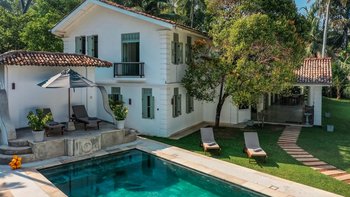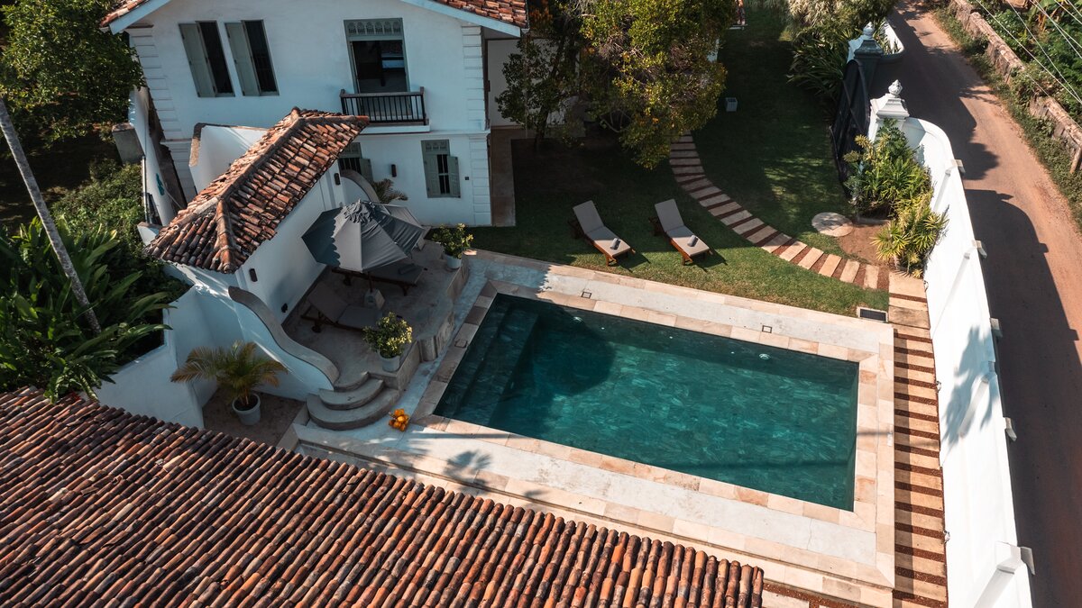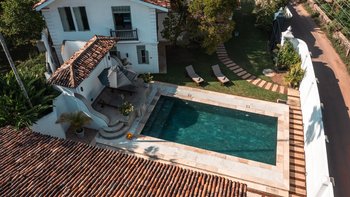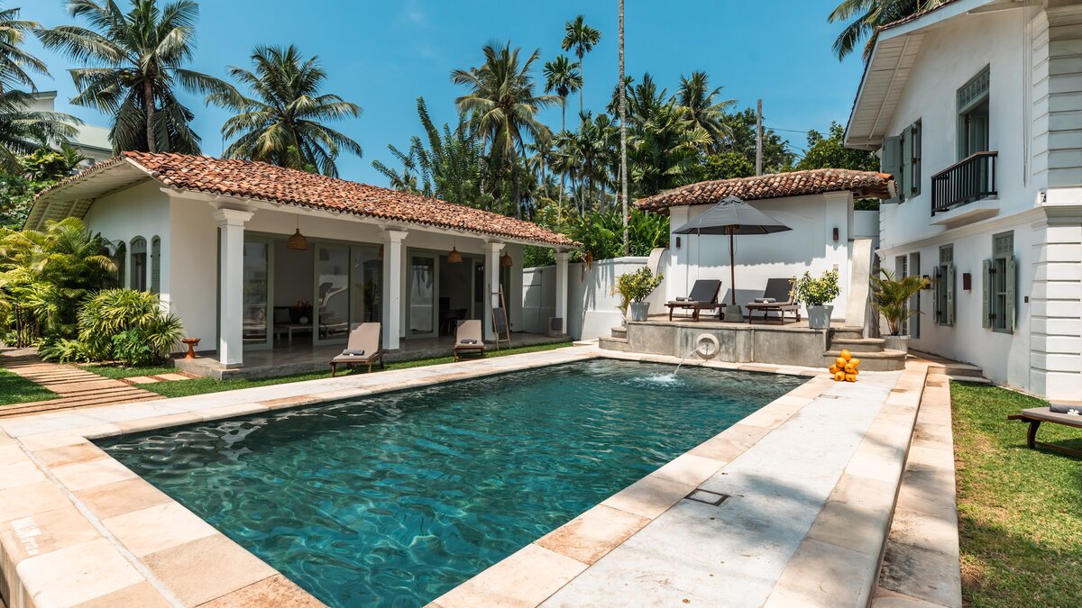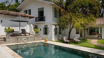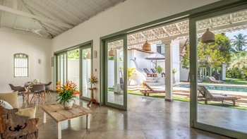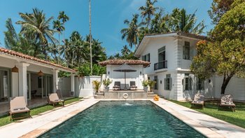 Pearl ist eine idyllische Villa mit sechs Schlafzimmern in Ahangama, Sri Lanka, komplett mit einem Poolhaus, Kochservice und luftigen, geräumigen Innenräumen. Dieser einladende Unterkunft wurde kürzlich mit schönen Innenmöbeln und minimalistischen Details renoviert und befindet sich nur einen kurzen Spaziergang vom nächsten Surfstrand entfernt.