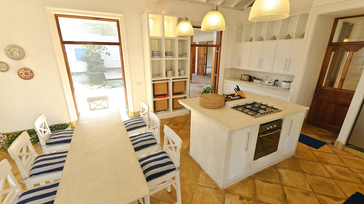 Das Turtle House ist wunderbar geräumig und durch sein cleveres Design gibt es viel luxuriösen Wohnraum, mit einem OFFENER GRUNDRISS Wohnzimmer, einem Spielzimmer am Pool und verschiedenen angrenzenden Balkonen und Terrassen. Eine gut ausgestattete Küche beherbergt marmorierte Steinarbeitsplatten, weiß getünchte Wände und gestreifte Frühstückshocker, was dies zu einem perfekten Ort für das Frühstück oder einen Kinderessbereich macht. Es gibt vier luxuriöse En-Suiten sowie ein lustiges Kinder-Etagenzimmer mit sechs Betten und einem Kinderbett. Diese Villa ist ein Traumferienhaus für Familien mit Kindern – es gibt einen Dschungel-Fitnessraumund Tischtennis, Brettspiele und anderes Kinderspielzeug und Bücher; der einladende L-förmige Pool grenzt an das Haus mit Blick auf die makellose Rasenfläche und spektakulärem Meerblick. Ein Team von 6 Mitarbeitern umfasst einen talentierten Koch, der jede Mahlzeit zubereitet.